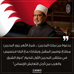 شيخ الأزهر يزور البحرين ويشارك مع البابا فرنسيس في ملتقى البحرين "حوارالشرق والغرب من أجل التعايش الإنساني "